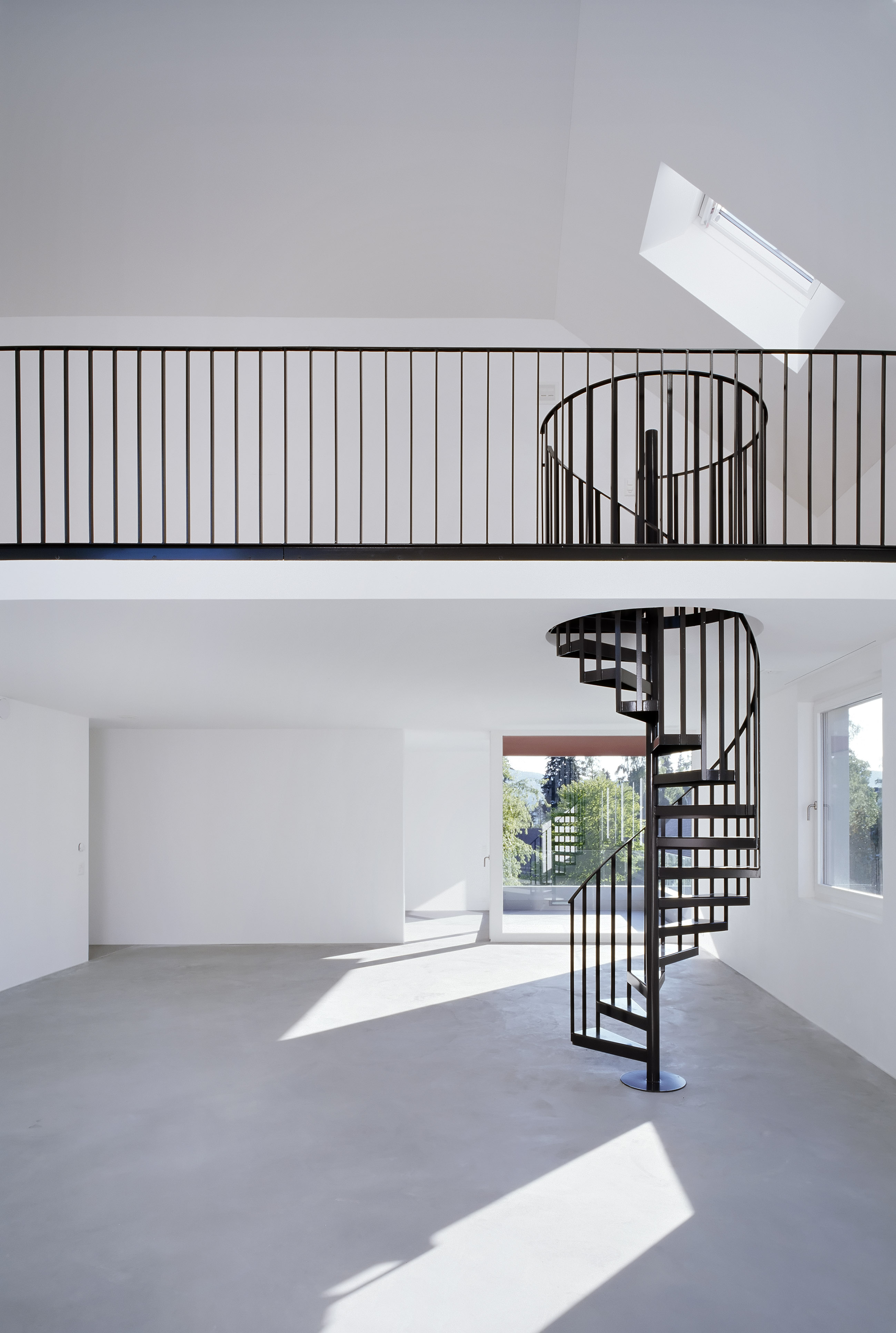 Das Gebäude geht über seine Kontur und Ausformulierung einen Dialog mit den umgebenden Bestandsbauten ein. Einzelne, für die Region typische Bauformen werden dabei neu interpretiert. So sind die quadratische Form des Grundrisses und die fassadenbündigen Lukarnen im ersten Dachgeschoss auch bei den umgebenden Altbauten zu finden. Die Lukarnen sind bei dem Neubau jedoch aus der Mittelachse geschoben und mit grösseren Fenstern versehen, damit die dahinter liegenden Atelier- und Lofträume ausreichend belichtet werden. Die Fenster wurden asymmetrisch unterteilt und der kleinere Bereich mit einem davor gesetzten Lochblech überdeckt. Der Ausblick wird dadurch kaum gestört, von aussen gesehen wirkt aber die Öffnungsfläche etwas reduziert. Entgegen dem System der Altbauten werden die Fensteröffnungen zum Erdgeschoss hin kleiner – die Proportionen wurden dabei auf die Höhe und die Lichtbedürfnisse der Räume angepasst.