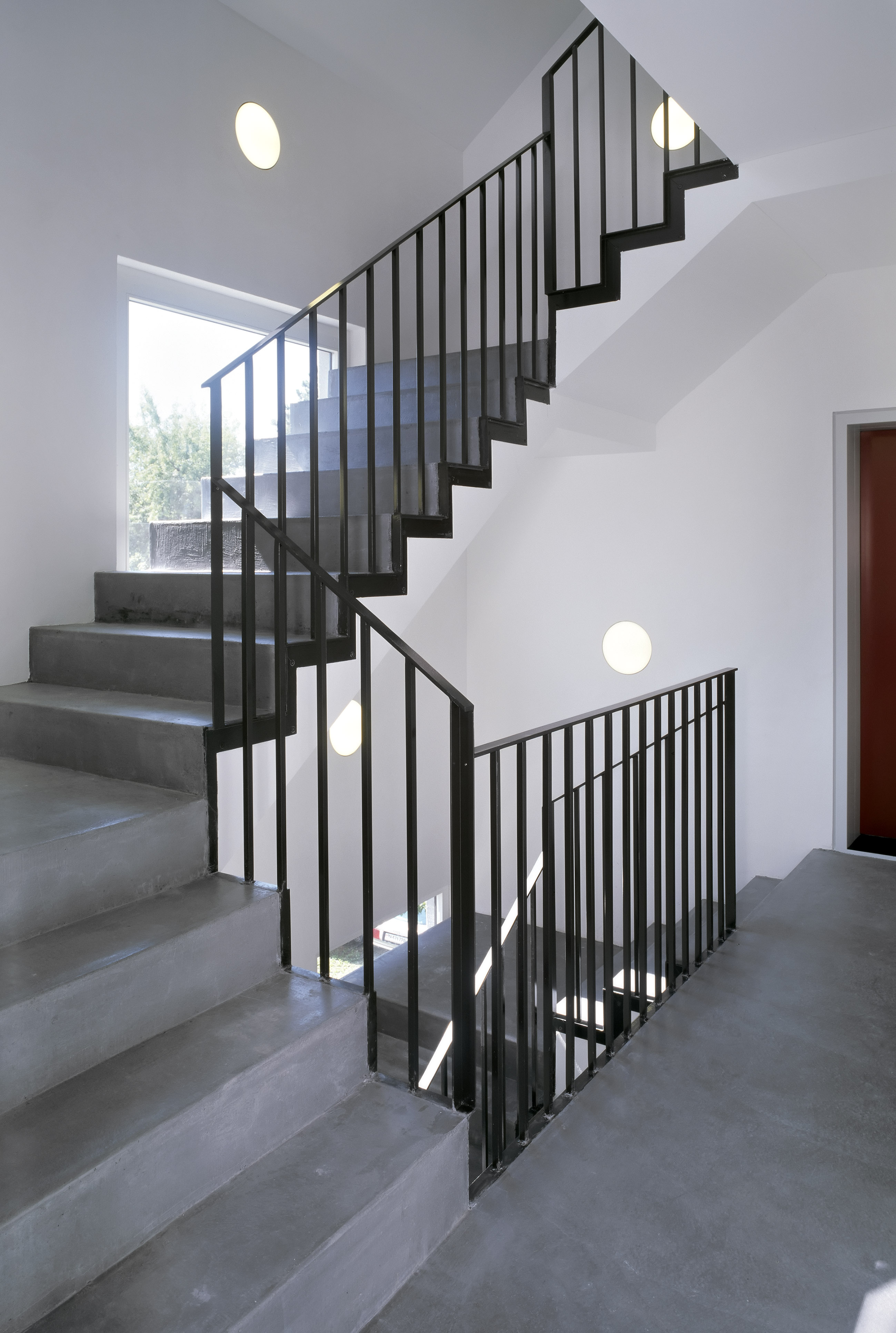 Die Aussenwände des Gebäudes wurden manuell mit einem hellgrau eingefärbten Sumpfkalkputz überzogen, was die Oberfläche lebendig wirken lässt. Einen Kontrast dazu bilden die schmalen dunklen Fensterrahmen und die dezenten grauen Fensterbänke aus Faserzementplatten. Einen Blickfang stellen die Decken der Terrassen dar, die gemeinsam mit der Künstlerin farbig gestaltet wurden und dem Haus eine Identität verleihen. Wenn Sonnenlicht an diesen Flächen reflektiert, werden die Wohnräume in verschiedene Lichtstimmungen getaucht.