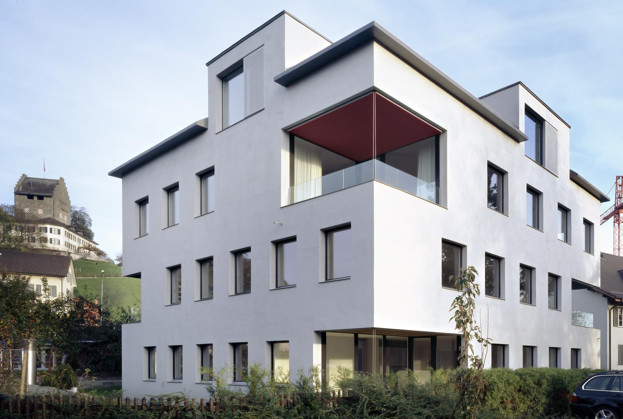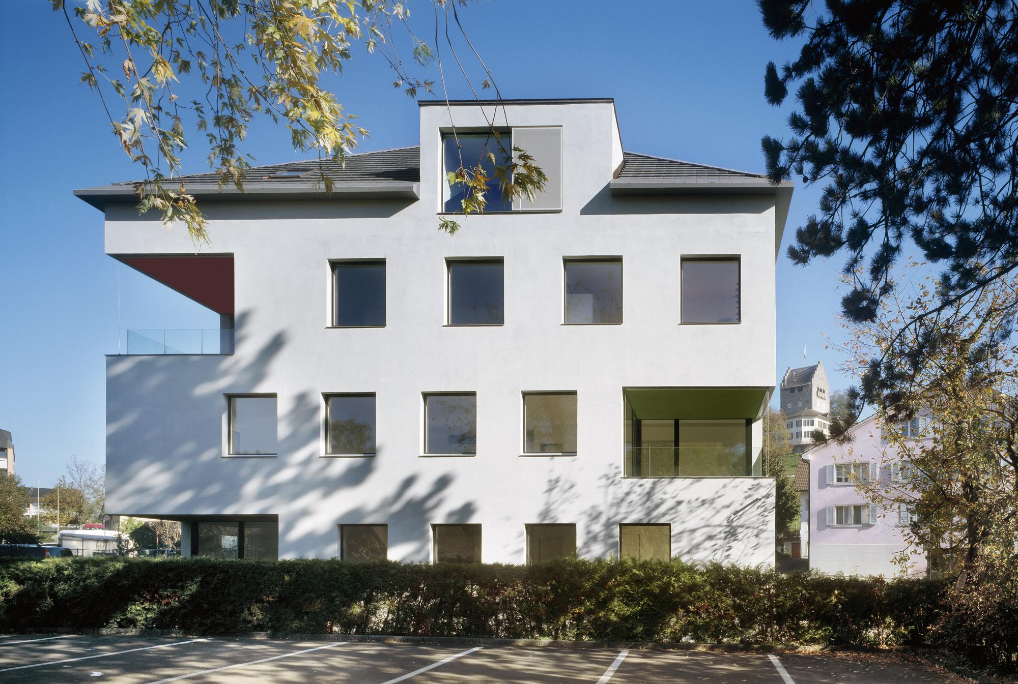 Inmitten der Stadt Uster, zwischen traditionellen und jüngeren Bauten und nahe dem Friedhof, steht das nach Minergie-Standard errichtete Mehrfamilienhaus. In den drei Regelgeschossen und der ausgebauten Dachetage sind insgesamt vier Wohnungen und ein Atelier untergebracht. Da sich das Grundstück in der Kernzone befindet, hätte bis zwei Meter an die Grundstücksgrenze heran geplant werden können. Gebaut wurde aber ein kleineres Gebäudevolumen, das an die Bauten der Umgebung angepasst ist und so dem Charakter des Ortes mehr entspricht.