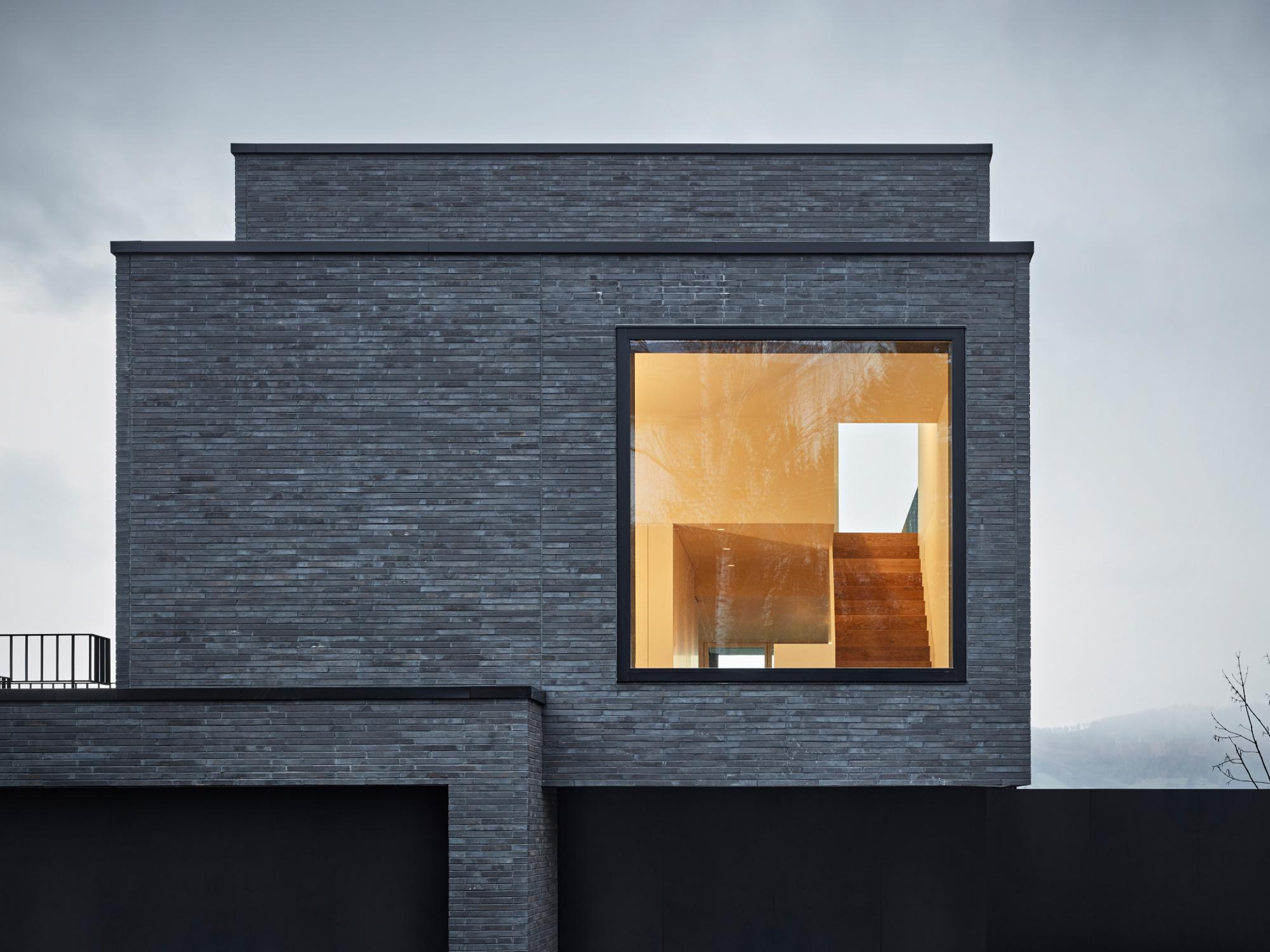Strassenseitig präsentiert sich der Bau sehr verschlossen. Hohe schwarze Metallwände, mit Türen zu den Abgängen ins Gartengeschoss, sichern das Haus zur Strasse. Auch das Garagentor und die Eingangsfront mit Haustür präsentieren sich im eleganten Schwarz. Dem Gegenüber steht das grosse, quadratische Fenster in der Nord-Ost Fassade, welches den Passanten Einblicke ins Wohngeschoss und Durchblicke Richtung Seeseite verschafft, wo sich das Haus mit grosszügigen, bodentiefen Fensterfronten öffnet.