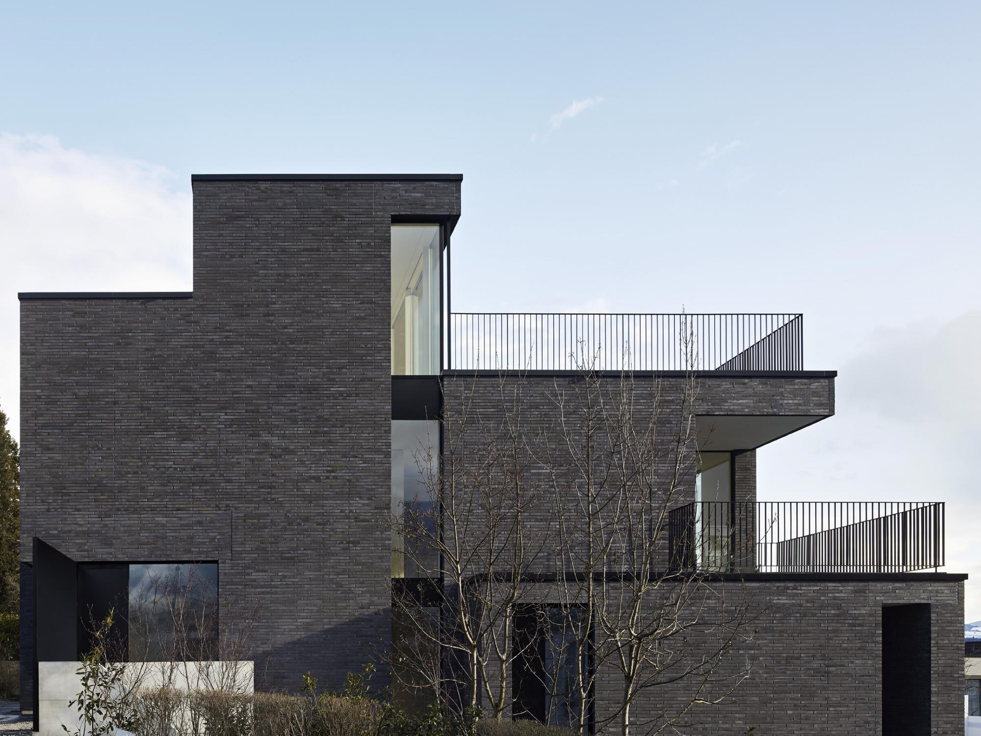 Black and White — Auf einer schmalen Parzelle, umgeben von 4-geschossigen Mehrfamilienhäusern, verteidigt das mit schwarzen, braun besandeten Klinkersteinen eingekleidete Einfamilienhauses imposant seinen Standpunkt. Die gestapelte Kubatur mit Ihren Vorsprüngen und Absätzen schafft ausdrucksstarke Akzente und wird durch die Schichtung des Sichtmauerwerks in seiner Klarheit untermauert.