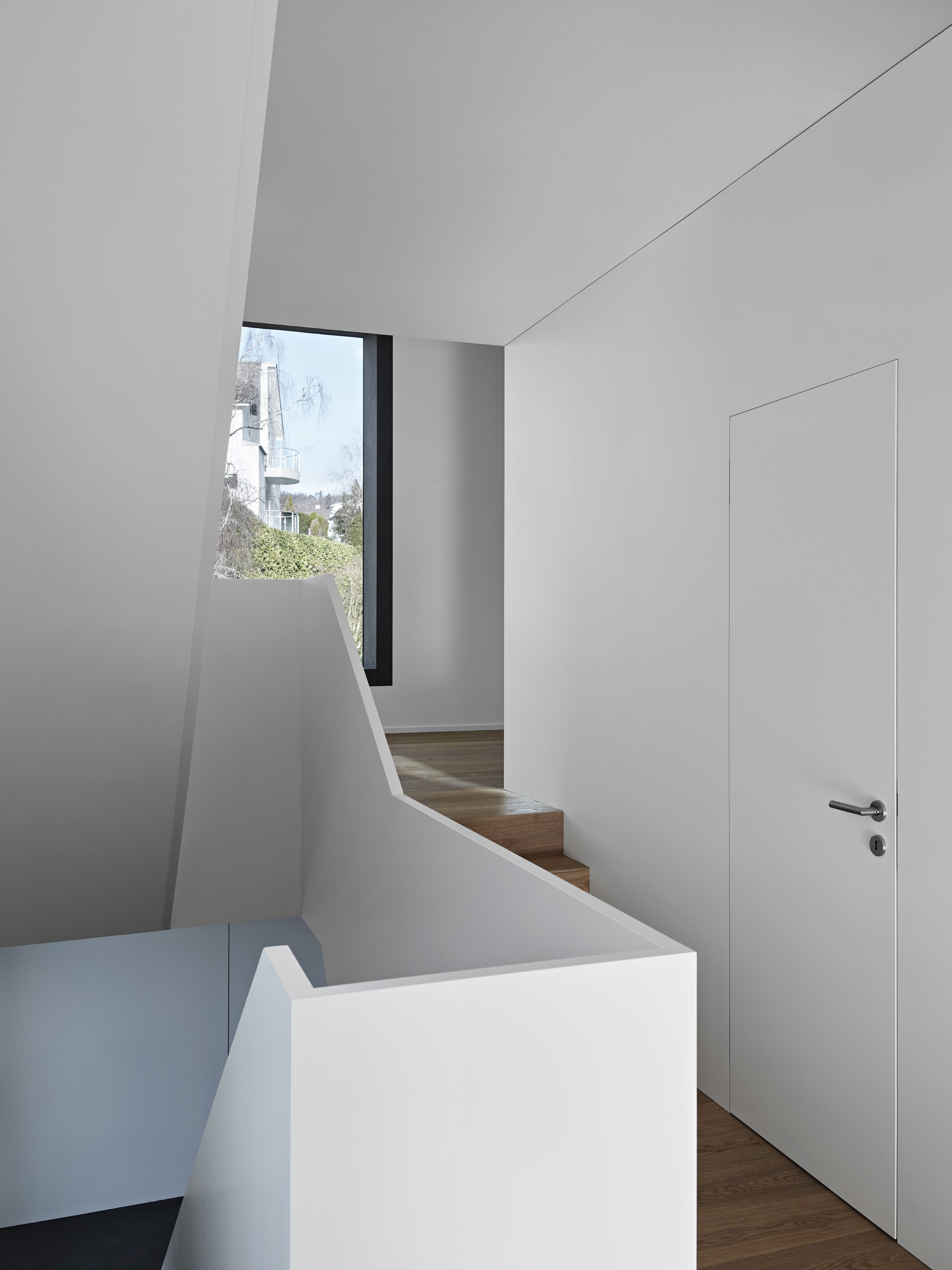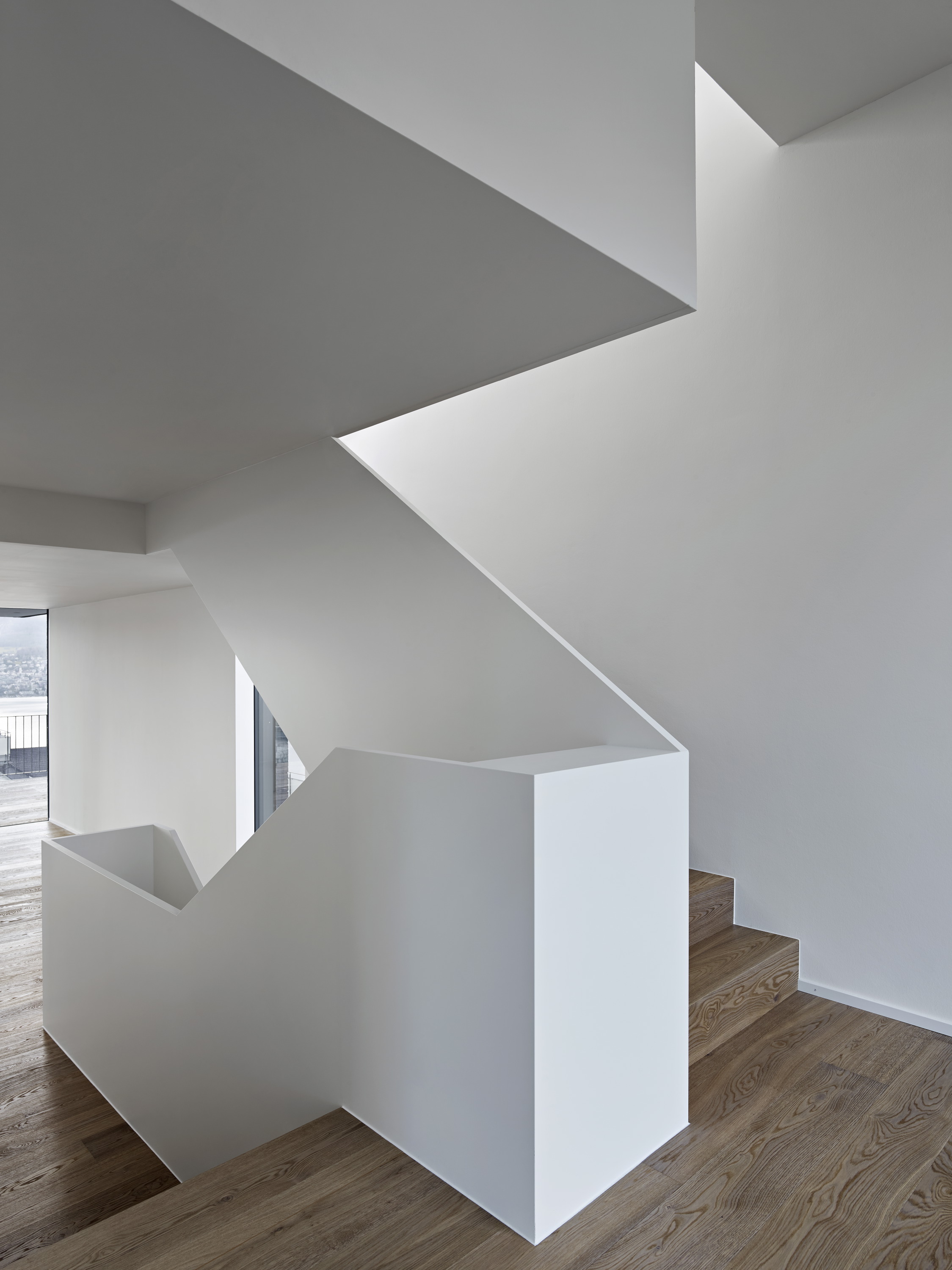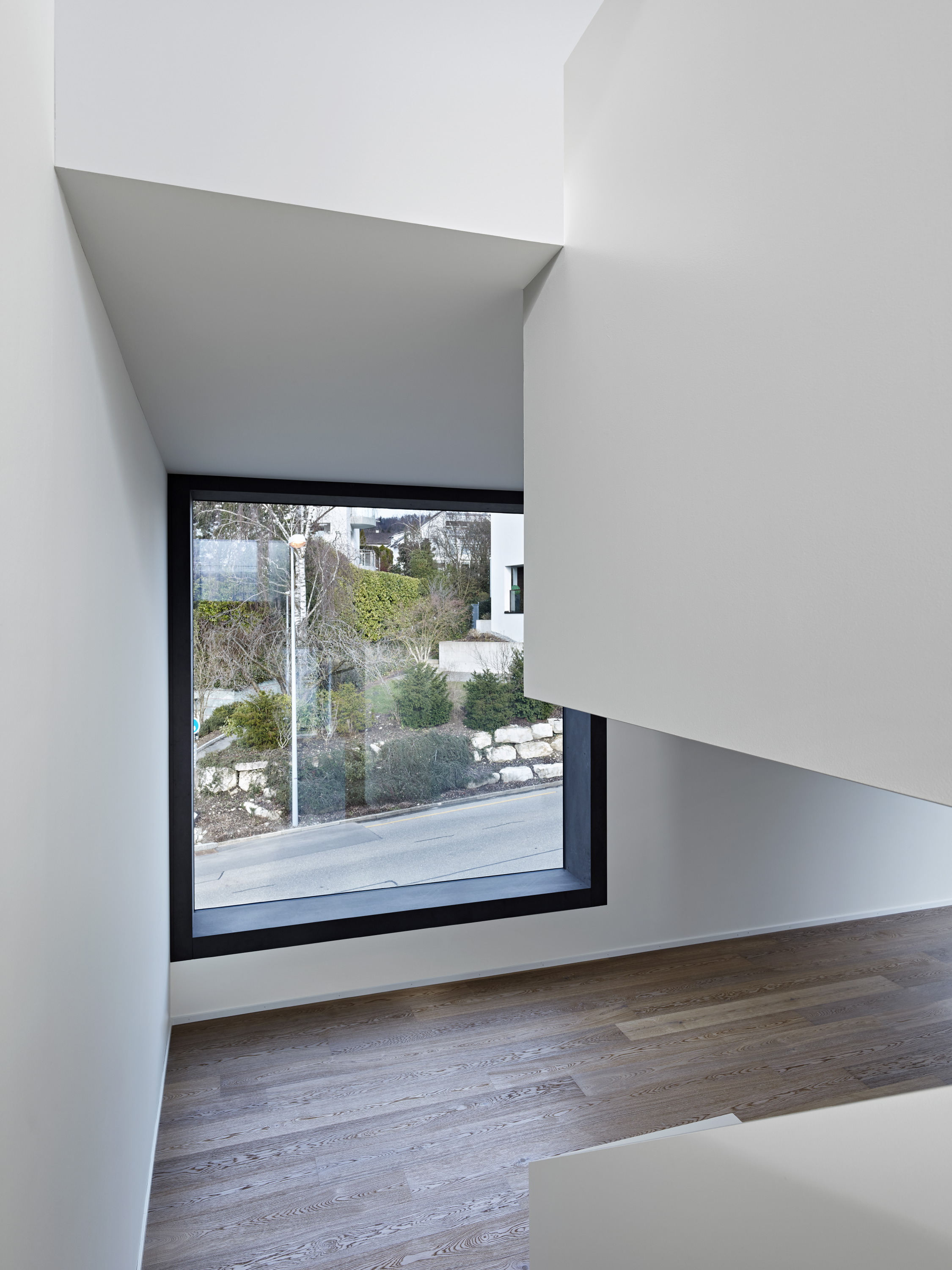 Auch die seitlichen Fassaden Richtung Süd-Ost und Nord-West, gewähren mit den karg gesetzten, bodentiefen Schlitzfenstern, Nachbarn und Passanten keine weitreichenden Einsichten, den Bewohnern hingegen spannende Lichtakzente und interessante, punktuelle Ausblicke. Die privaten Aussenräume zeigen in Ihrer Hauptausrichtung Richtung See und lassen mit Ihren filigranen, schwarzen Metallgeländern die Blicke weit schweifen. Das Eingangs- und Gartengeschoss ist von Treppen und Stützwänden in Sichtbeton seitlich eingefasst. Das Durchschreiten im Inneren und Äusseren schafft immer wieder neue Räume, Einblicke und Durchblicke und erzeugt ein Spannungsfeld, in dem Langeweile ein Fremdwort zu sein vermag.