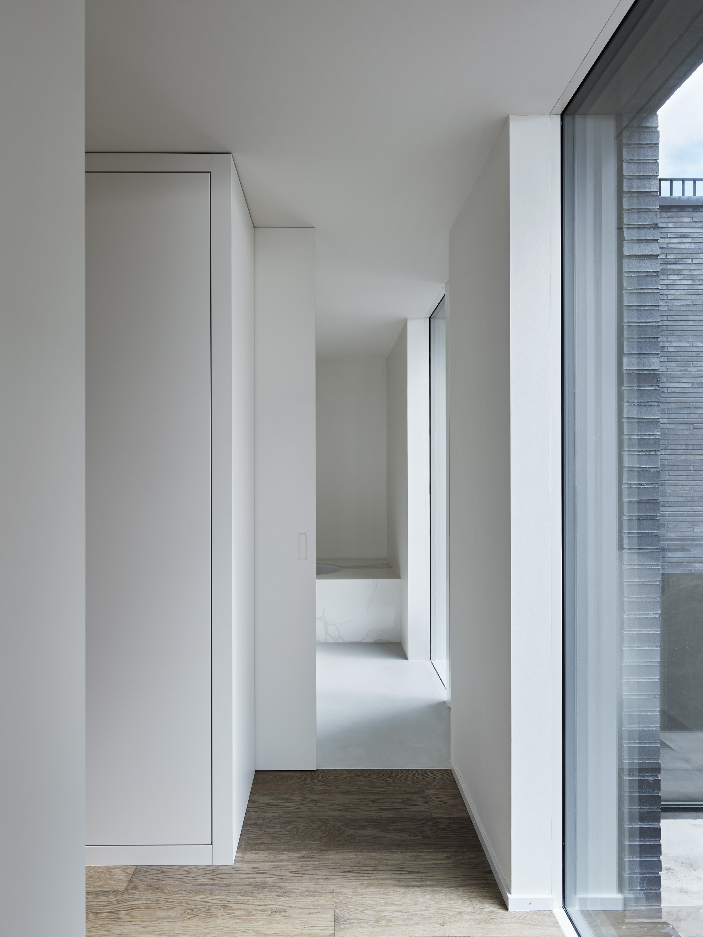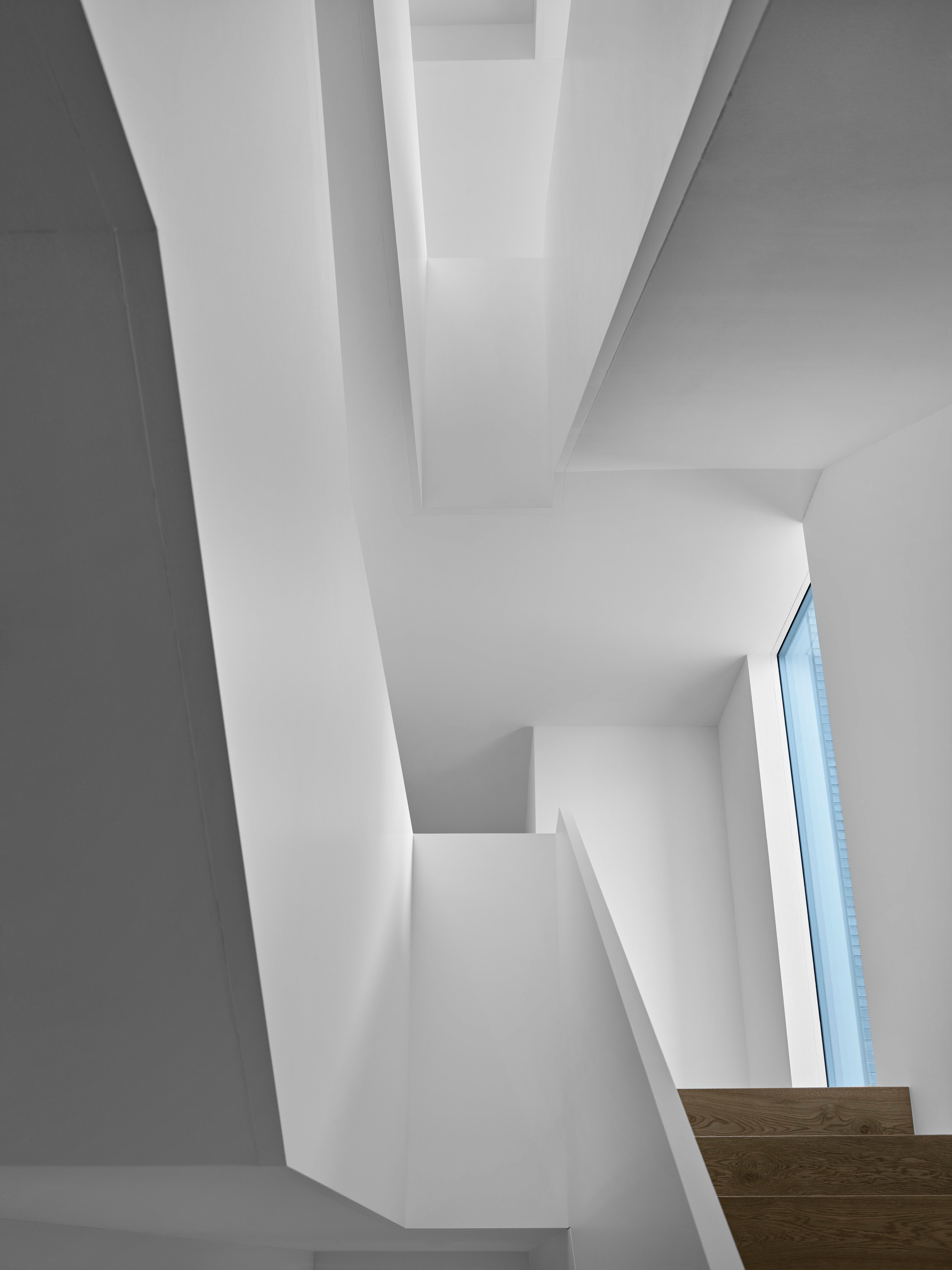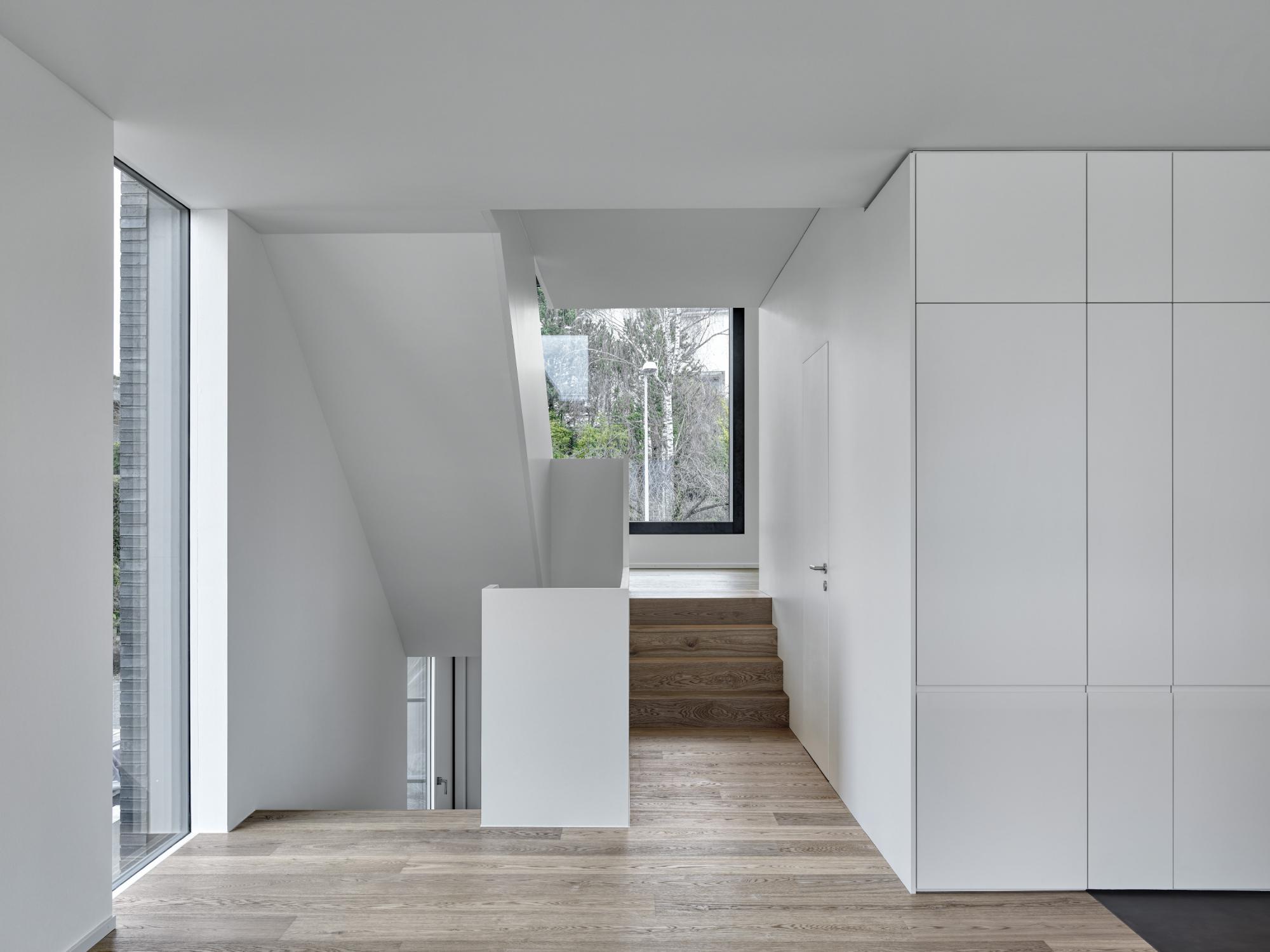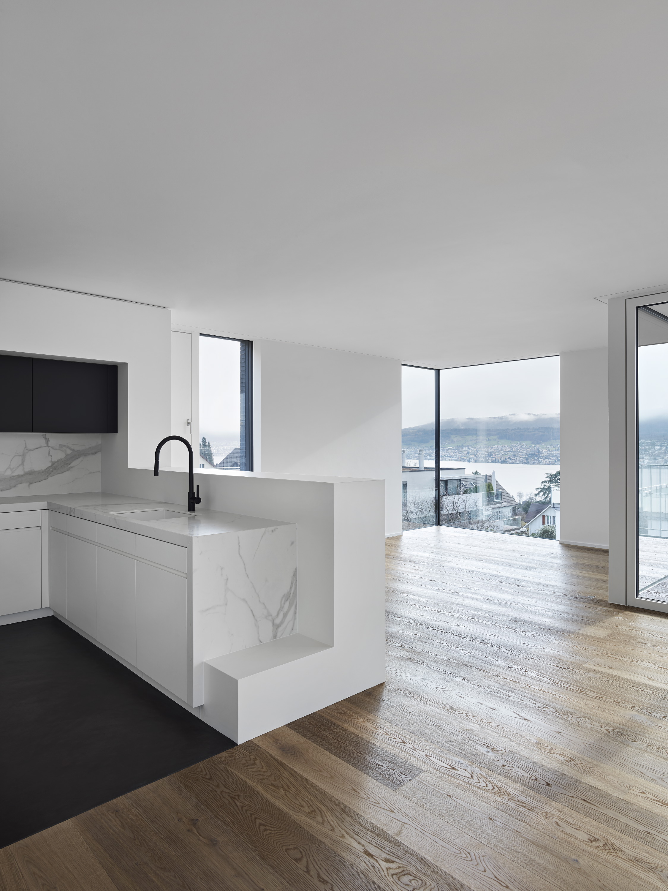 Auch die seitlichen Fassaden Richtung Süd-Ost und Nord-West, gewähren mit den karg gesetzten, bodentiefen Schlitzfenstern, Nachbarn und Passanten keine weitreichenden Einsichten, den Bewohnern hingegen spannende Lichtakzente und interessante, punktuelle Ausblicke. Die privaten Aussenräume zeigen in Ihrer Hauptausrichtung Richtung See und lassen mit Ihren filigranen, schwarzen Metallgeländern die Blicke weit schweifen. Das Eingangs- und Gartengeschoss ist von Treppen und Stützwänden in Sichtbeton seitlich eingefasst. Das Durchschreiten im Inneren und Äusseren schafft immer wieder neue Räume, Einblicke und Durchblicke und erzeugt ein Spannungsfeld, in dem Langeweile ein Fremdwort zu sein vermag.