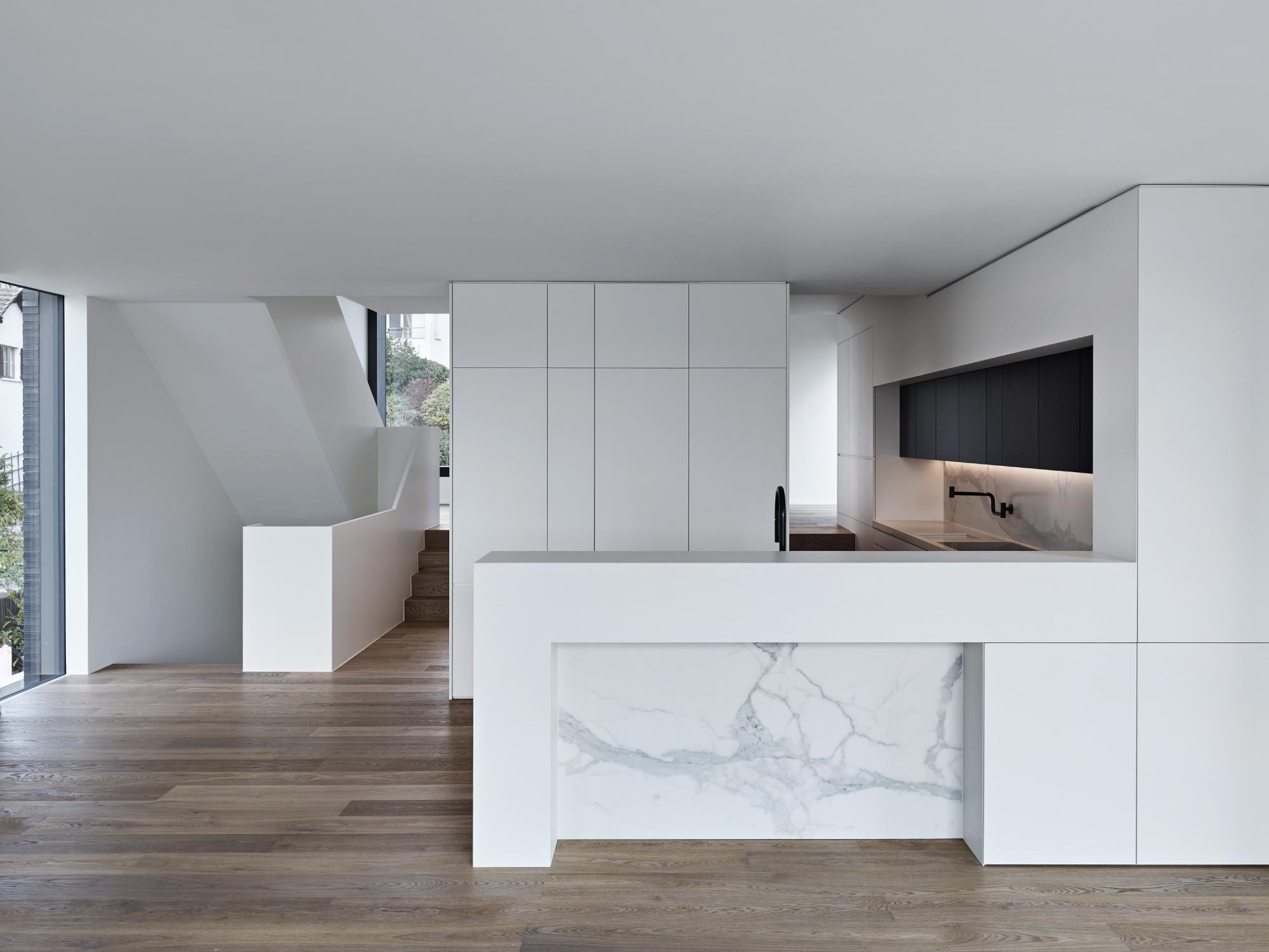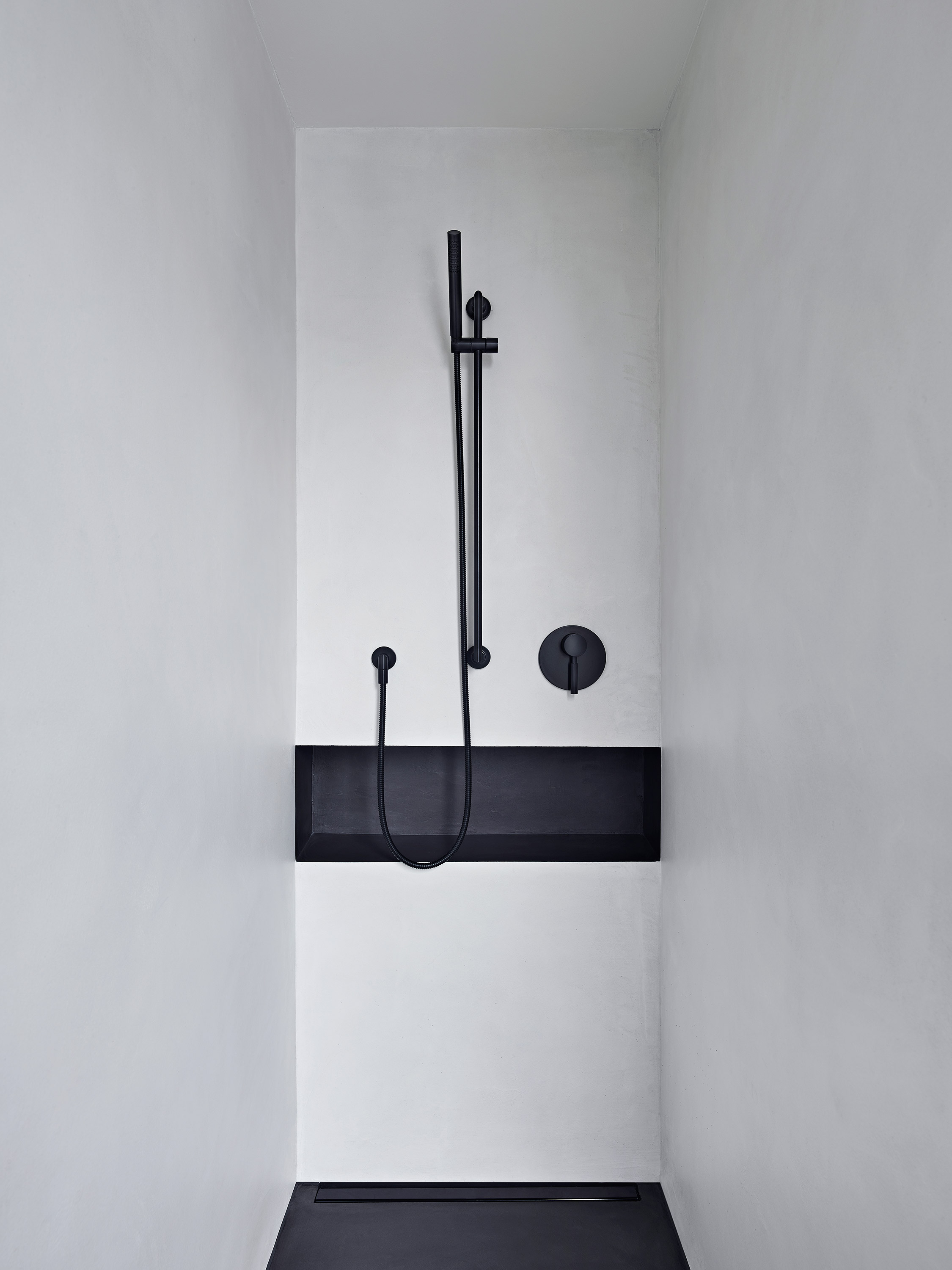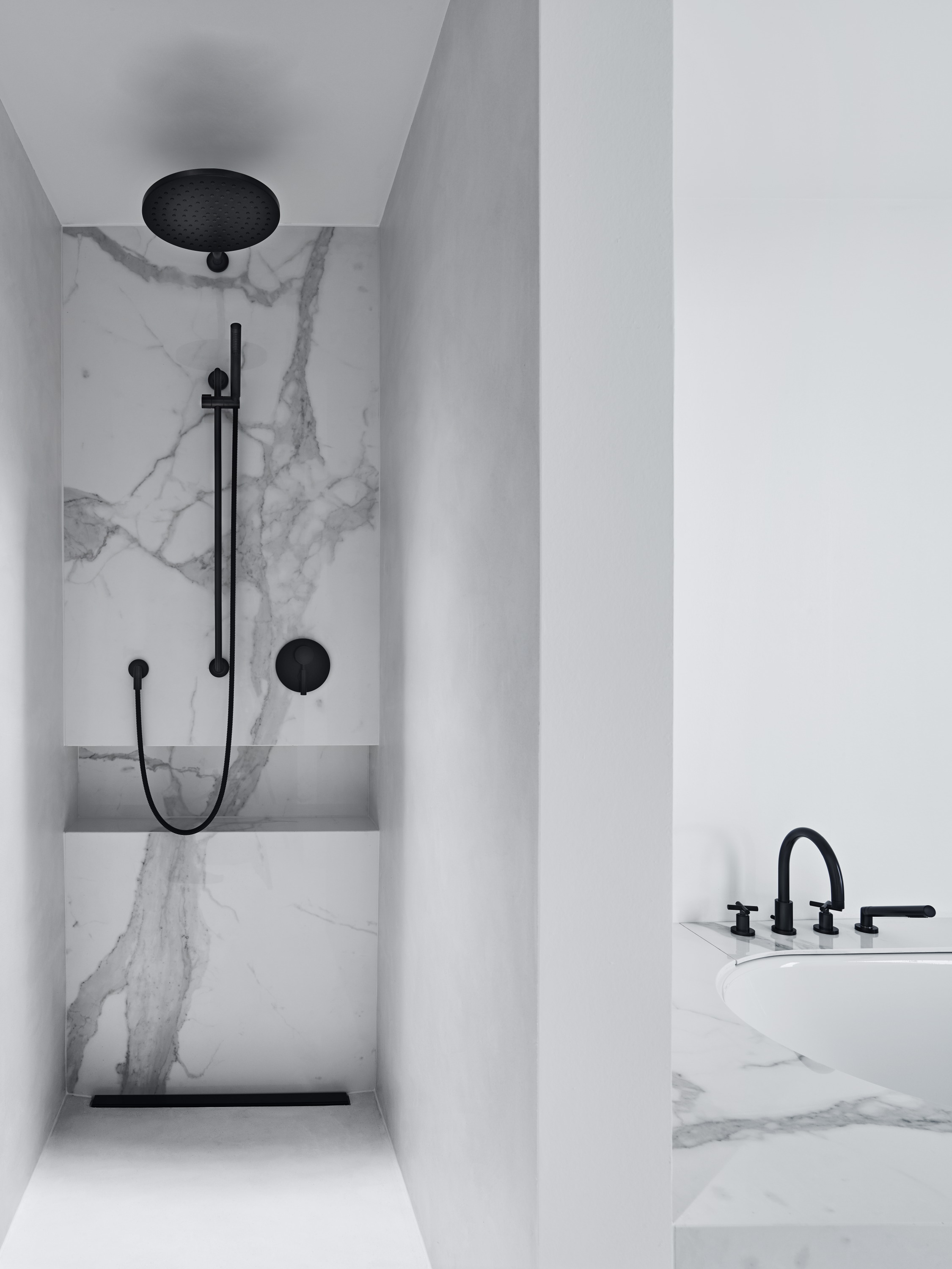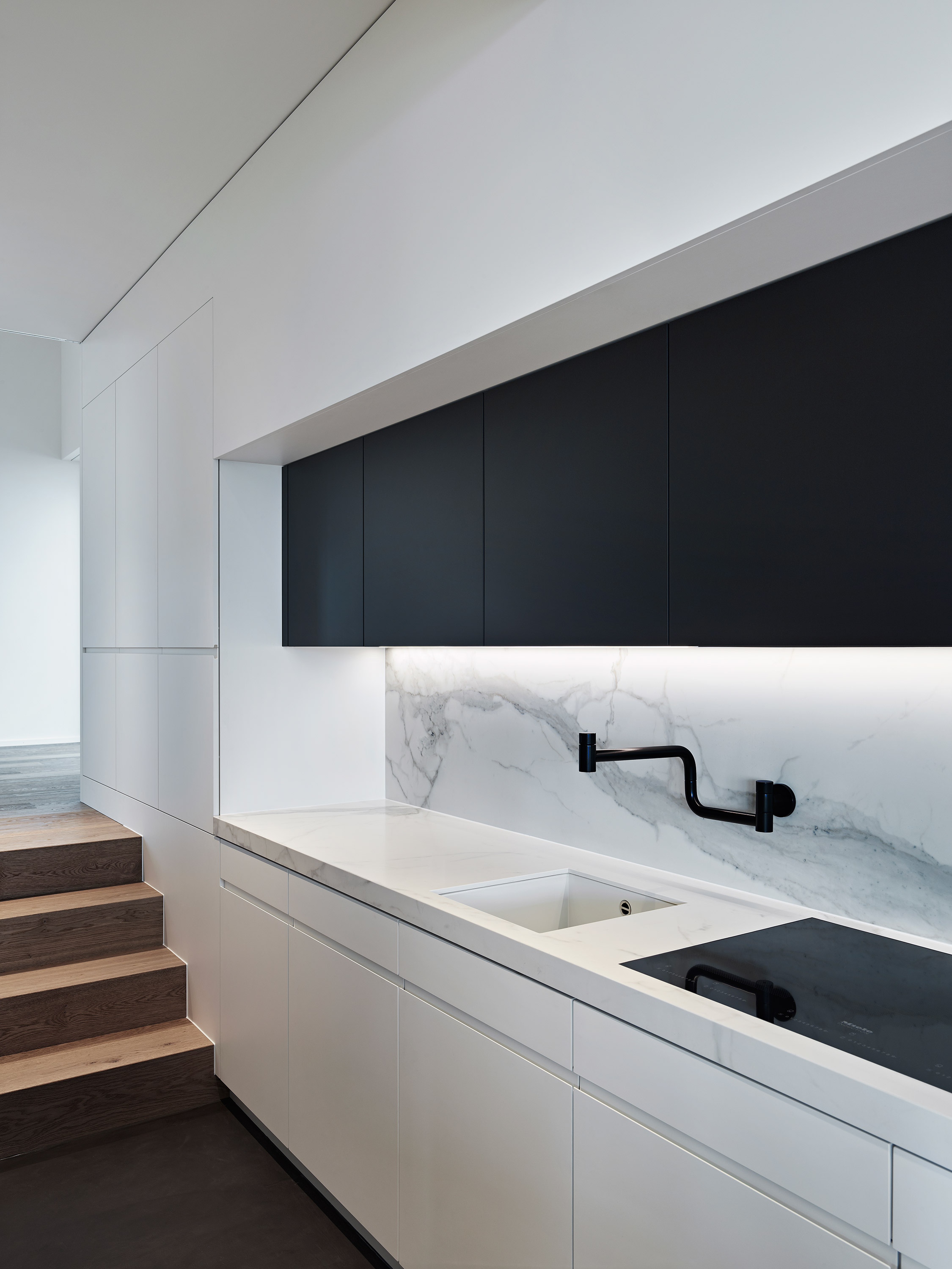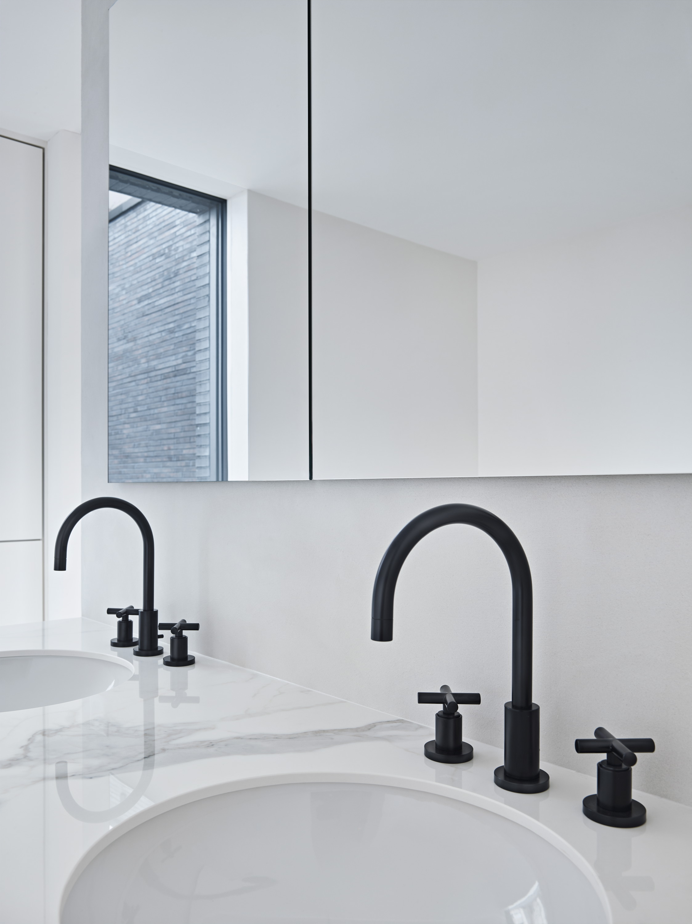 Im Inneren des Hauses findet sich die Farbe Schwarz in Fenster- und Spiegeleinfassungen, Armaturen und mineralischen Bodenflächen wieder. Im Zusammenspiel mit weissen Oberflächen an den Wänden, dem Einsatz von Keramik in Calacatta Optik, entsteht ein gewollt monochromes Gesamtkonzept.